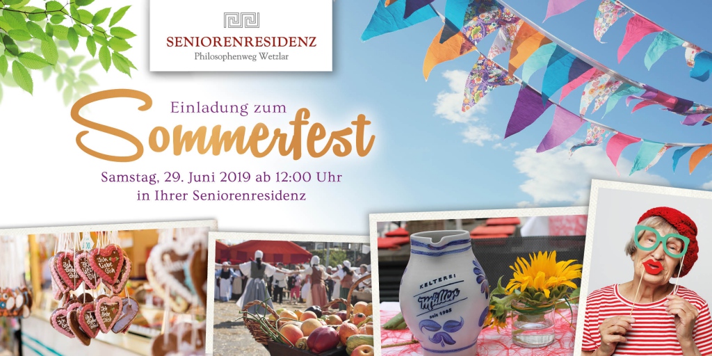 | 29.06.2019 | Sommerfest in der Seniorenresidenz Philosophenweg Wir laden Sie gerne ein zu unserem diesjährigen Sommerfest am 29. Juni 2019 ab 12.00 Uhr. Lassen Sie sich überraschen und genießen Sie ein paar Stunden in der Einrichtung... weiterlesen |  |