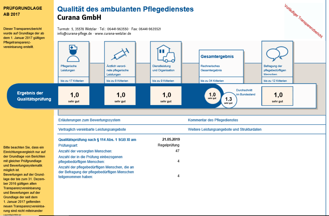 Am  21.Mai 2019 wurde der Komfortpflegedienst CURANA in der Qualität seiner Arbeit geprüft. Hierzu kommt einmal jährlich im Auftrag der Pflegekassen der Medizinische Dienst der Krankenkassen in die Institution, um sich von dem aktuellen Tun ein Bild zu verschaffen. Die Bereiche Pflege und medizinische Versorgung, Betreuung und Alltagsgestaltung, Hauswirtschaft und Hygiene werden einen ganzen Tag lang geprüft.